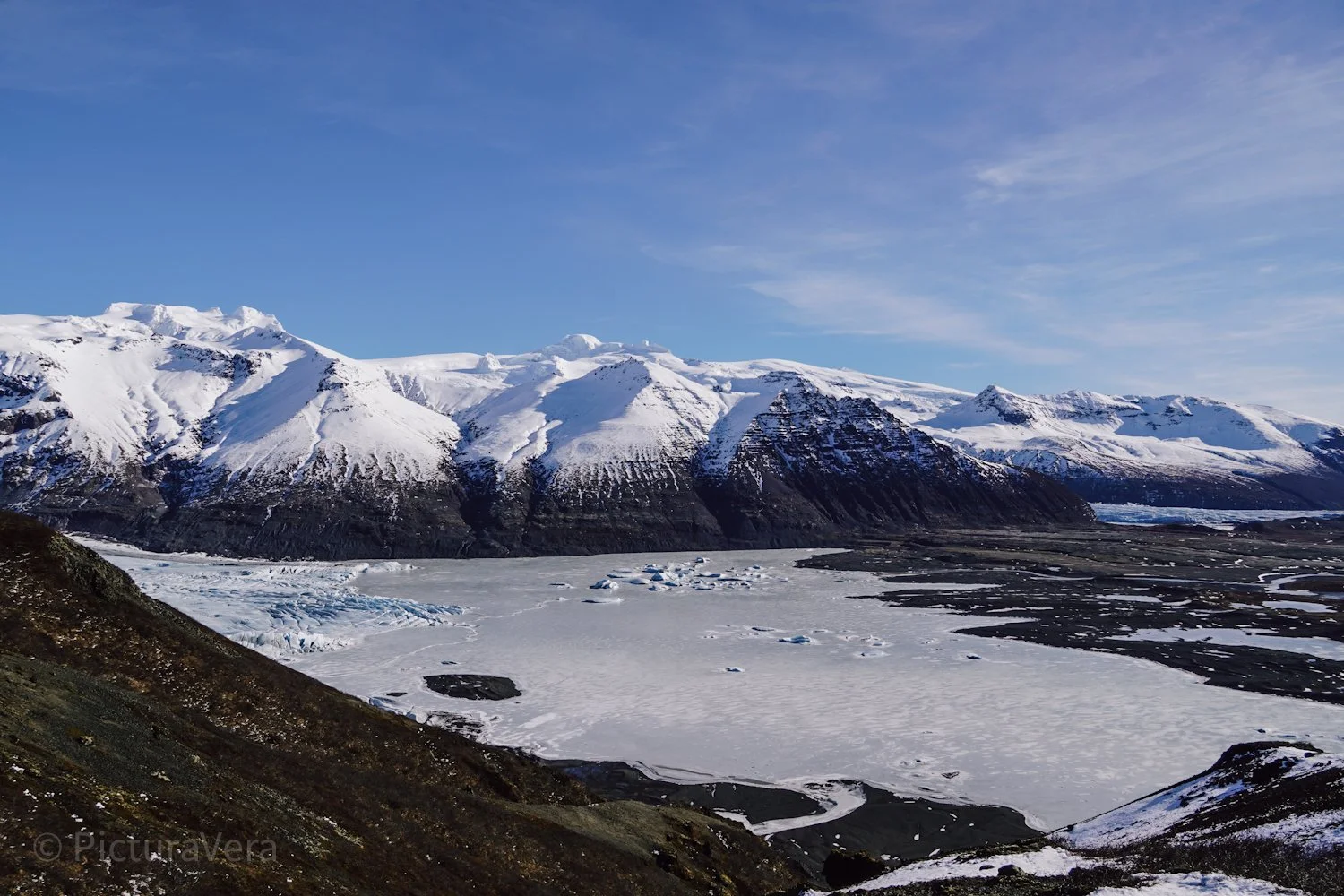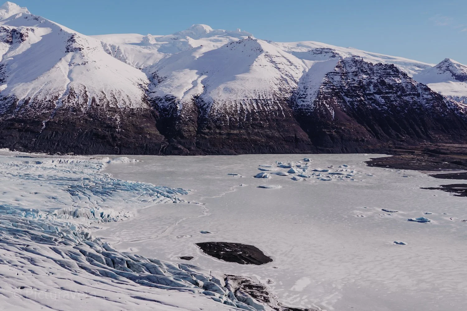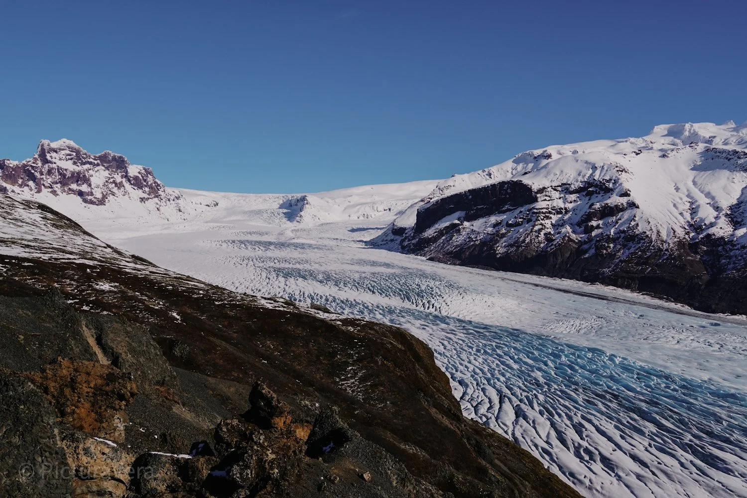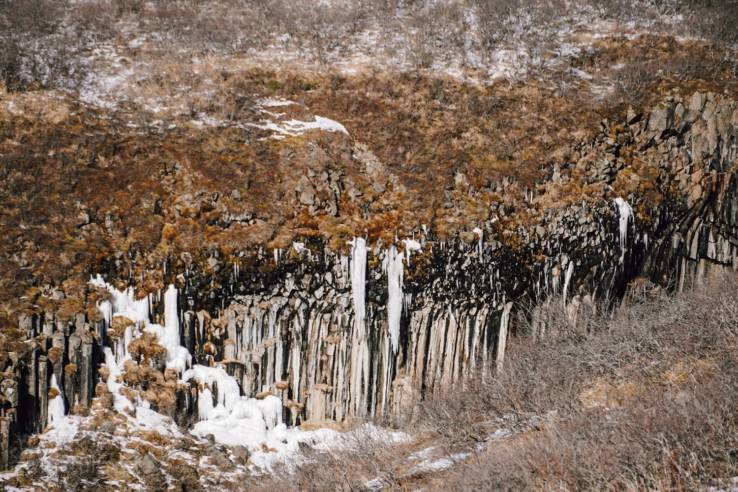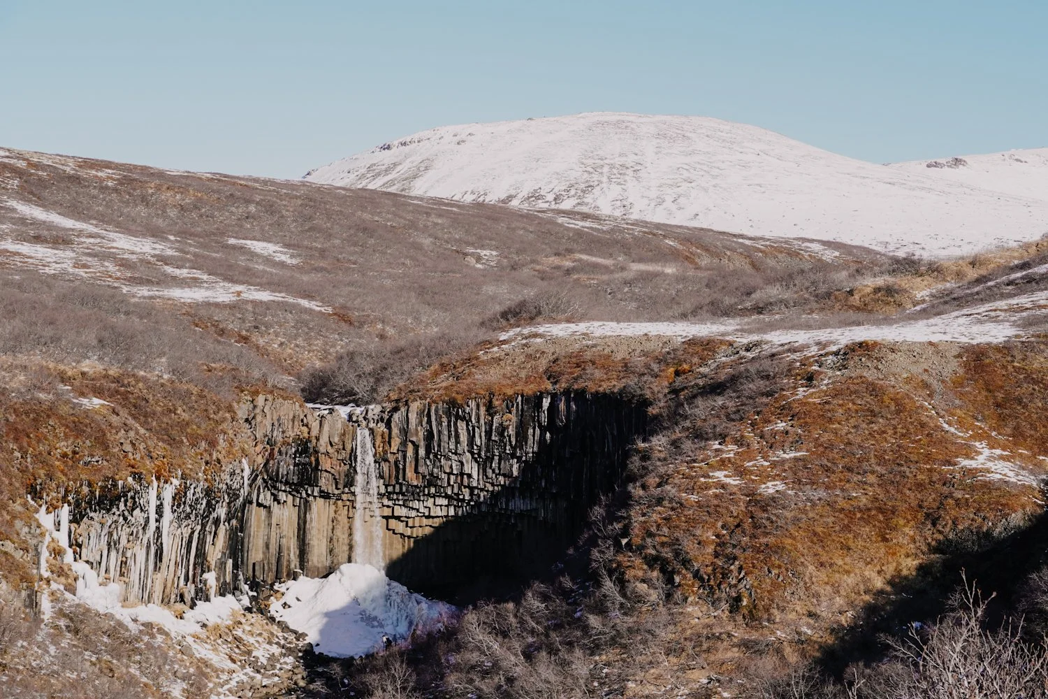 Wanderung zum berühmten Svartifoss Wasserfall. Weiter geht es über vereiste Wege, einsame Landschaften, wunderschöne Aussichten bis zu einem beeindruckenden Ausblick auf eine blaue Gletscherzunge des Vatnajökulls.